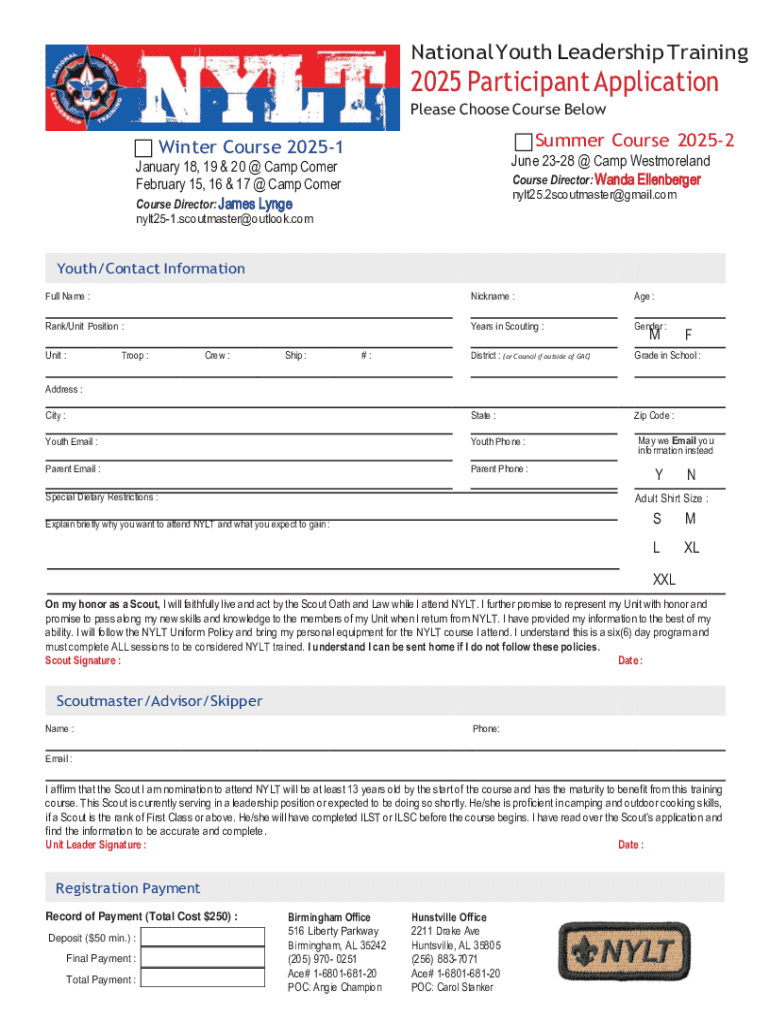Application form for youth participants to enroll in the National Youth Leadership Training (NYLT) program, detailing requirements, course options, and necessary information for registration.