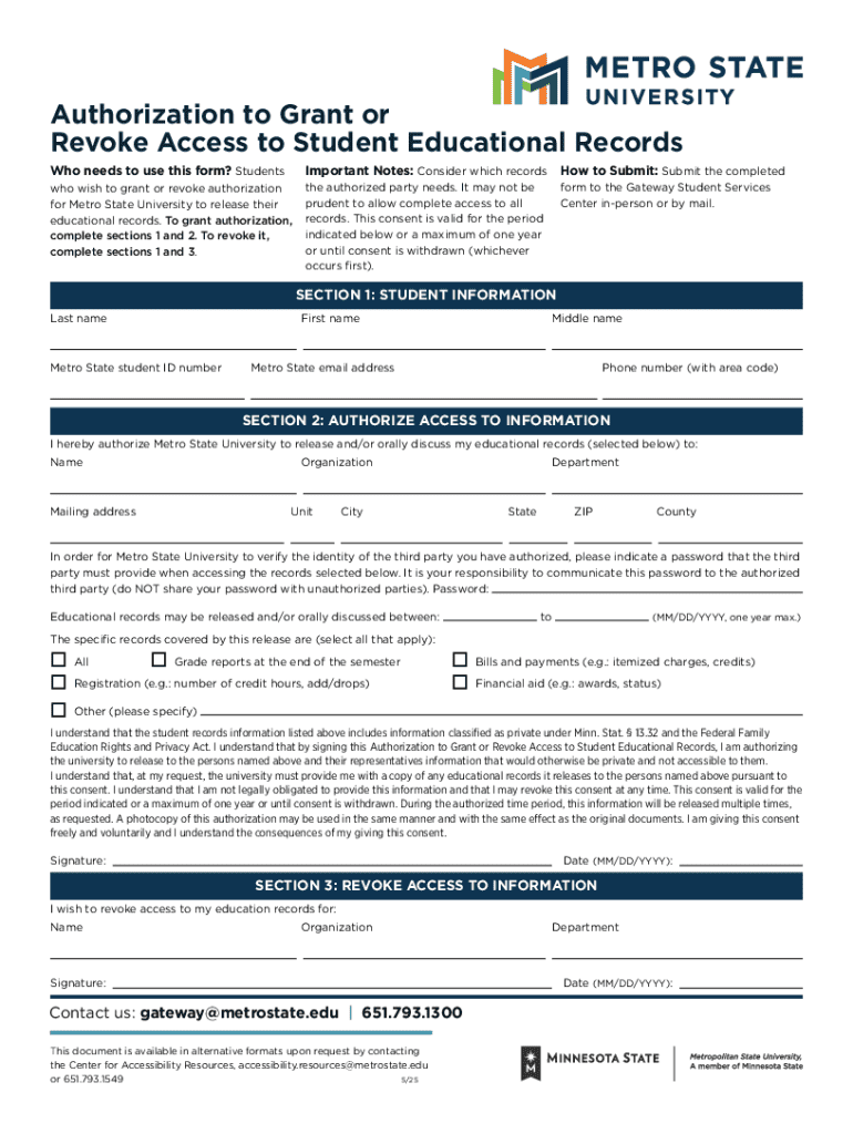 This form is used by students at Metro State University to grant or revoke authorization for the release of their educational records to designated parties.
