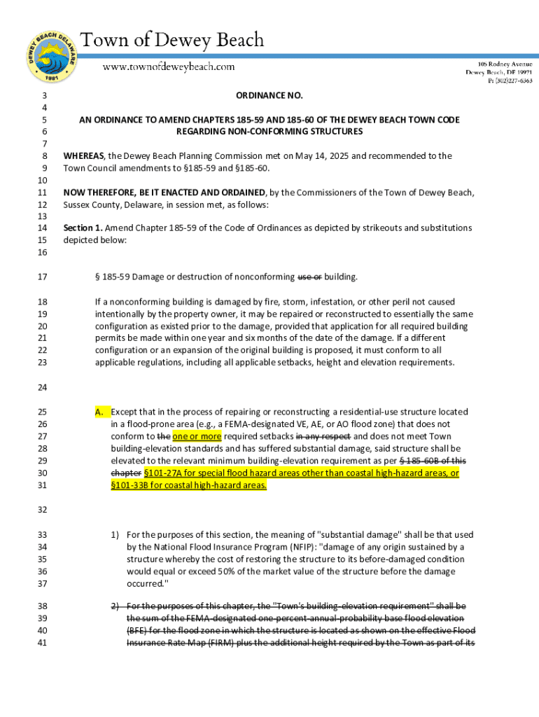 An ordinance to amend Chapters 185-59 and 185-60 of the Dewey Beach Town Code regarding non-conforming structures, detailing conditions for repair and expansion of such structures, particularly in