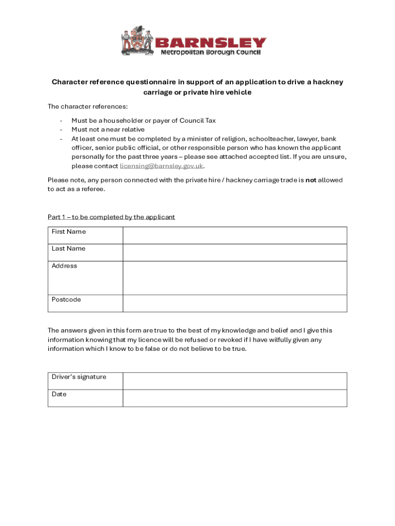 This document serves as a character reference questionnaire for individuals applying to drive a hackney carriage or private hire vehicle, outlining requirements for referees and information to be