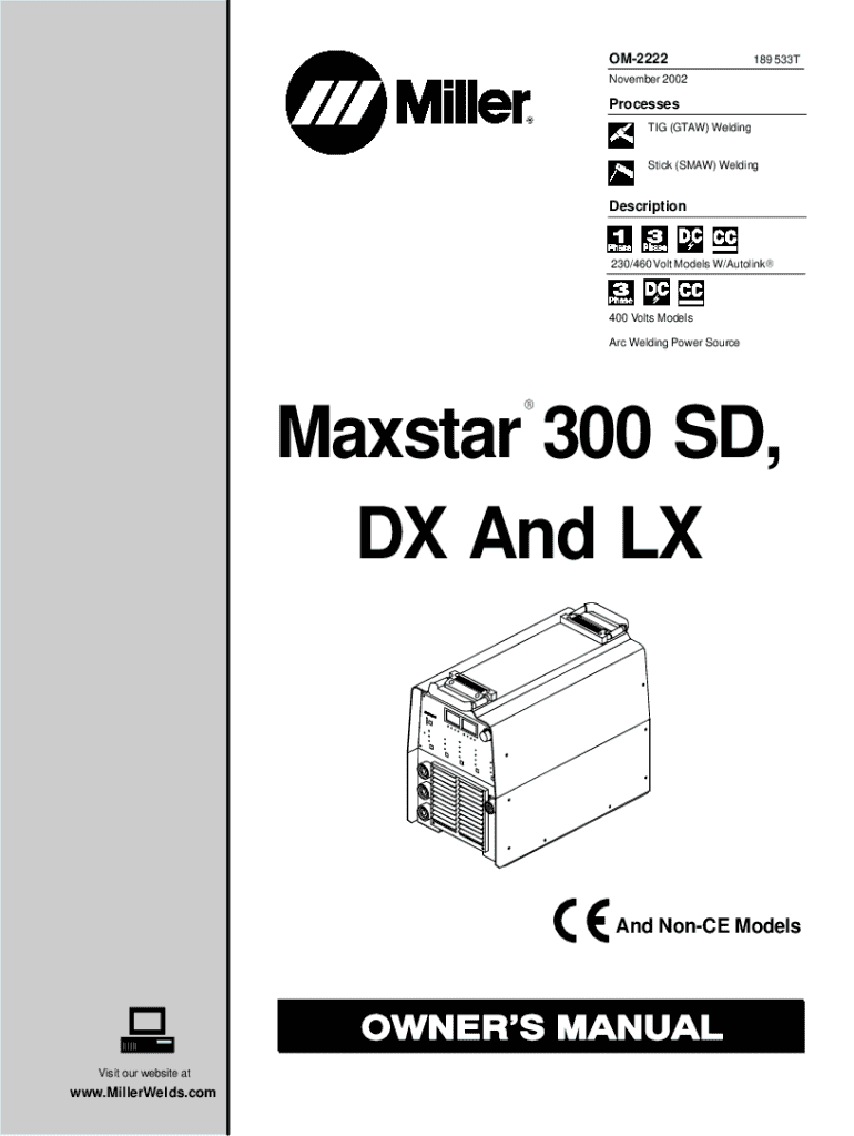 This document provides safety precautions, operational instructions, and maintenance guidelines for the Maxstar 300 SD, DX, and LX arc welding machines manufactured by Miller Electric.