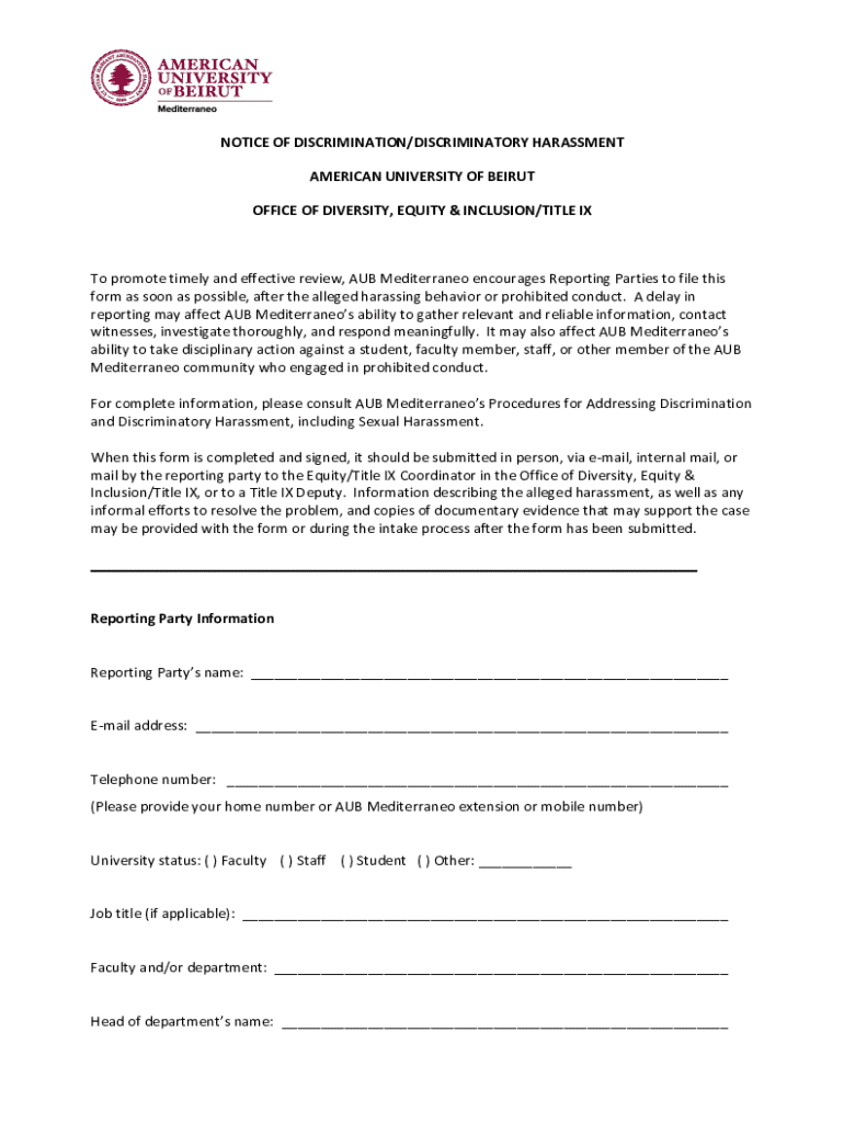 This document serves as a form for reporting incidents of discrimination, discriminatory harassment, or retaliation at the American University of Beirut, promoting timely and effective review of such
