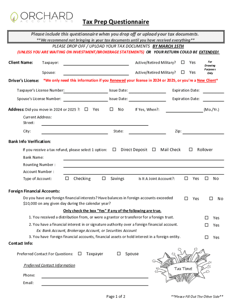 The tax prep questionnaire form plays a fundamental role in the tax preparation process. This structured document helps both individuals and businesses gather essential financial data, simplifying the often complex job of filing taxes. By utilizing a tax prep questionnaire, taxpayers can ensure that they provide their tax preparers with accurate and comprehensive information, reducing the risk of errors and potential audits.