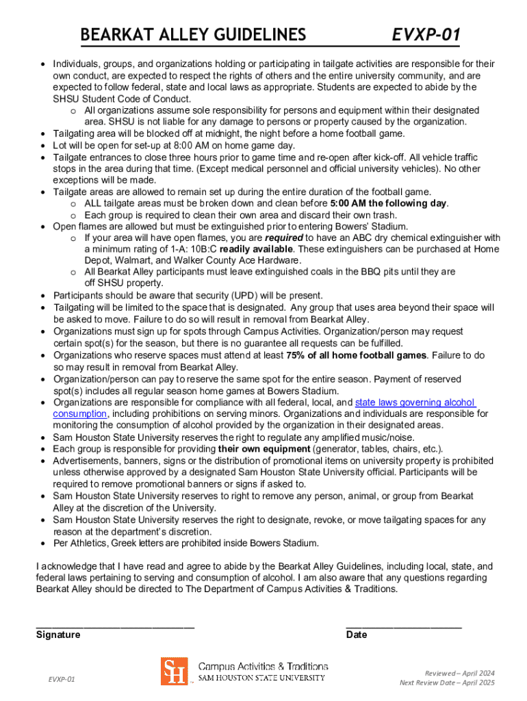 Compliance with the Bearkat Alley Guidelines Form isn't merely a suggestion; it is vital for planning successful tailgates. This form not only clarifies the rules but also helps participants understand their responsibilities and the regulations they must follow during events. Key features of the guidelines include specific event requirements, space allocations, and compliance confirmations for participants wishing to host tailgating activities.