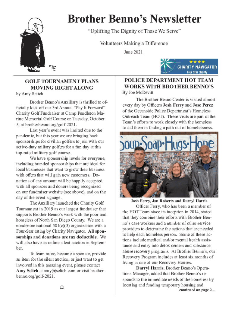 This newsletter provides updates on Brother Benno’s charity initiatives, including a golf tournament, police department collaborations, scholarships for local students, and volunteer highlights.