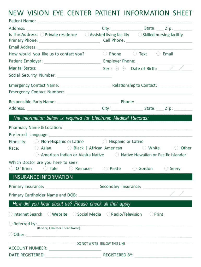 Get the free New Vision Eye Center Patient Information Sheet