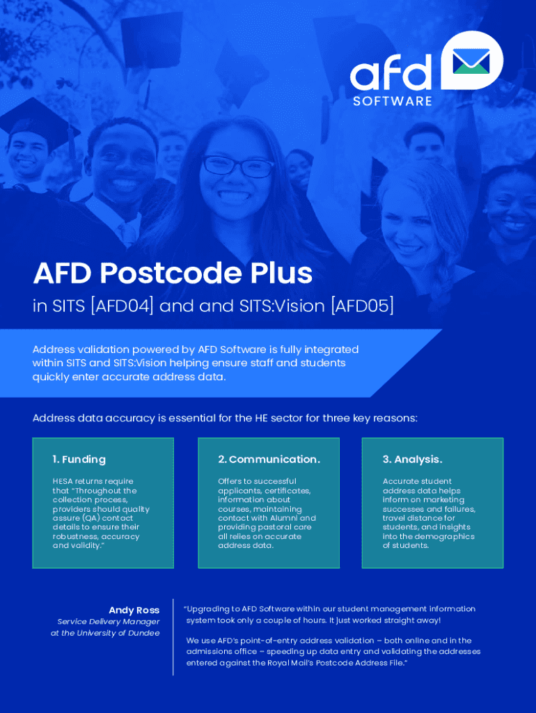 Before creating your AFD Postcode Plus form, it's essential to assess your document needs. Identify the types of forms you wish to create, considering factors such as user demographics and the specific information required for effective processing. Understanding the importance of accurate postcodes is crucial; incorrect data can hinder communication and result in costly errors.