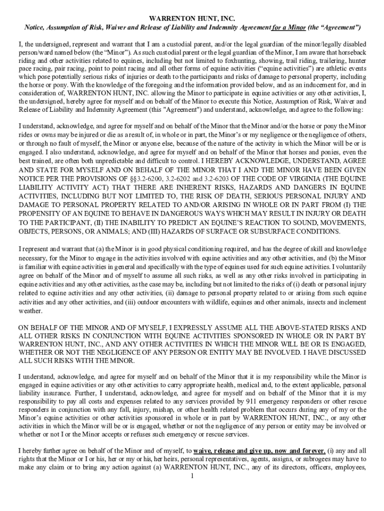 Get the free Notice, Assumption of Risk, Waiver and Release of Liability and Indemnity Agreement ...