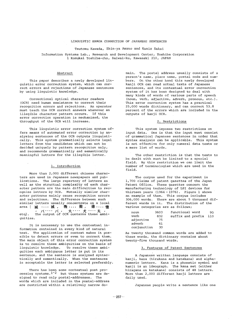 LINGUISTIC ERROR CORRECTION OF JAPANESE SENTENCES Custom Canada, Shiny Amino and Unit Sakai Information systems Lab., Research and Development Center, Toshiba Corporation 1 Samurai Toshiba, Saiwaiku,