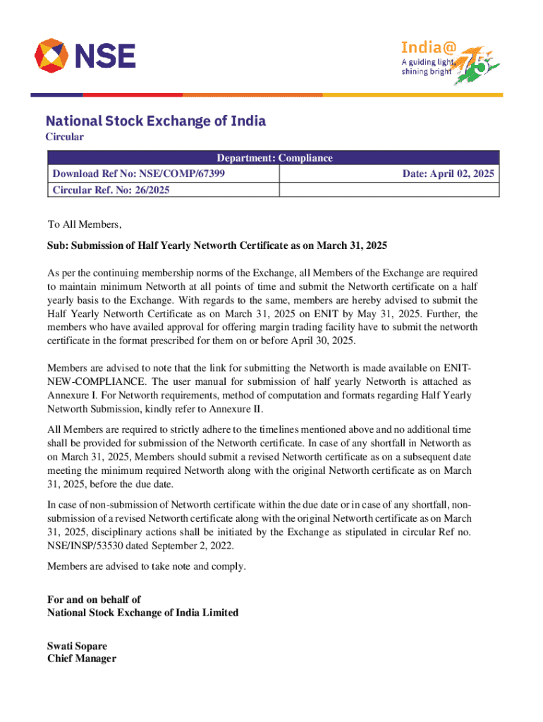 This document outlines the requirements and instructions for National Stock Exchange members to submit their Half Yearly Networth Certificate for the period ending March 31, 2025.