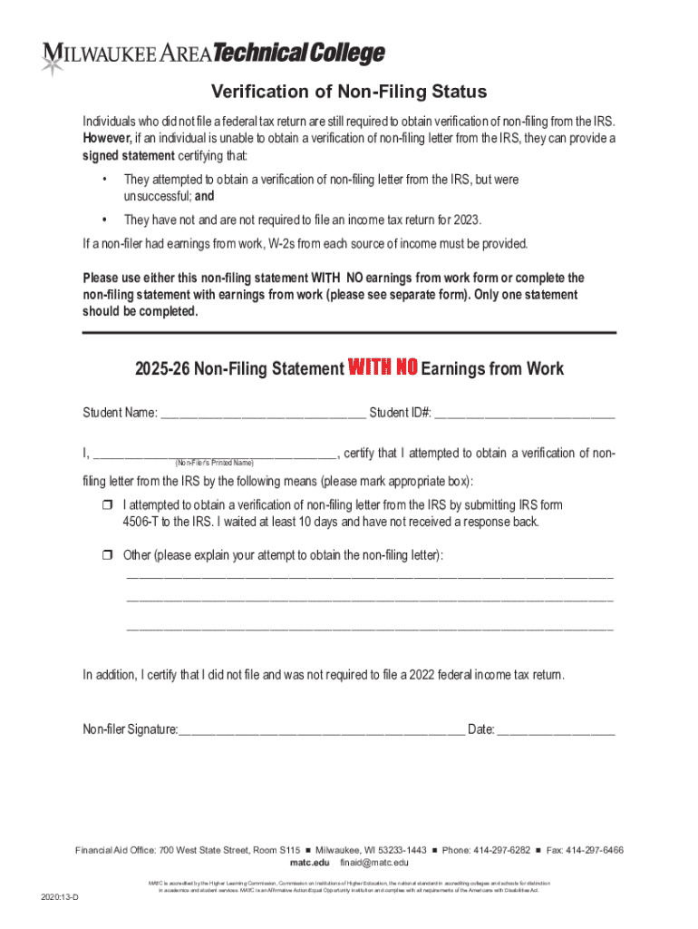 Individuals who did not earn enough income to file a tax return or who are applying for financial aid and need to prove they did not file are required to submit verification of non-filing status.