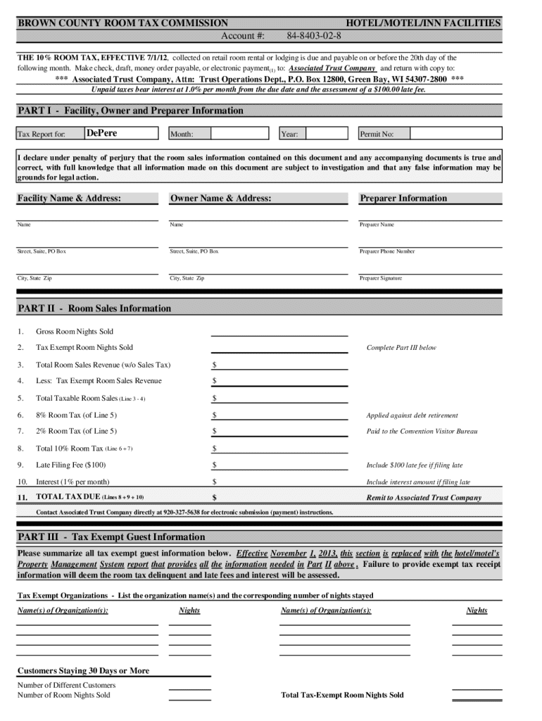 For any questions or assistance relating to the Brown County Room Tax Form, reaching out to local tax offices can provide clarity. The Brown County tax office offers resources including direct contact numbers and in-person assistance for query resolution.