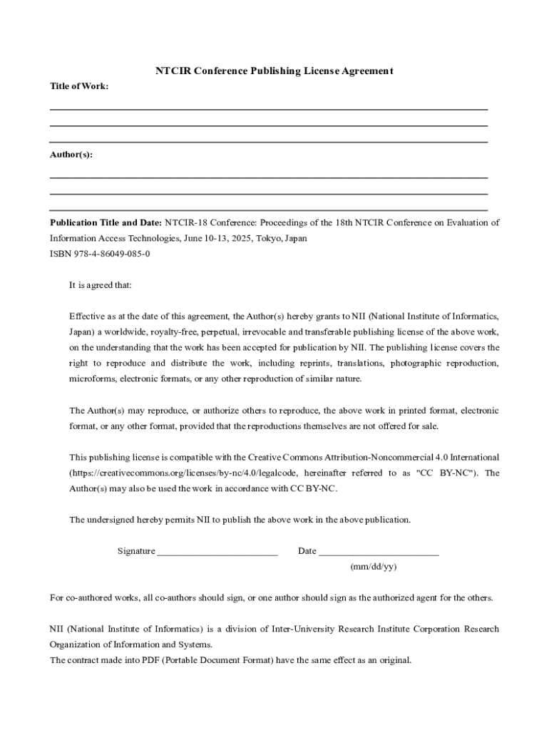 All authors who have submitted a paper to be presented at the NTCIR conference are required to file the NTCIR conference publishing license.