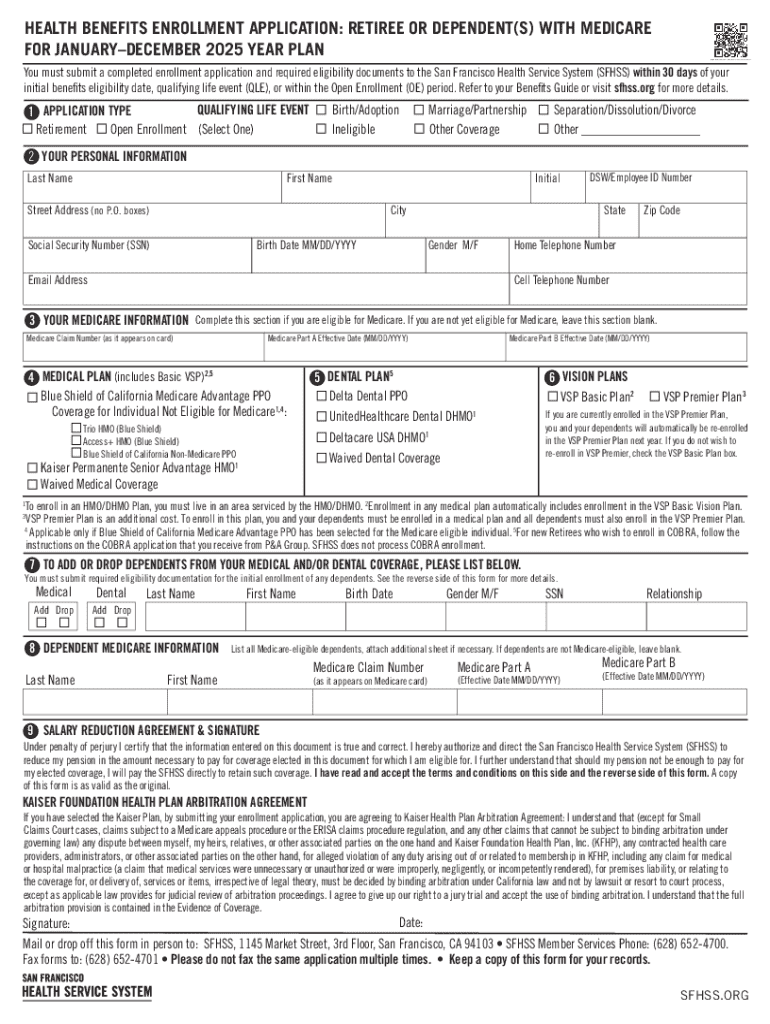 This document serves as an application for health benefits enrollment for retirees or dependents eligible for Medicare for the year 2025, detailing necessary information, qualifying life events, personal