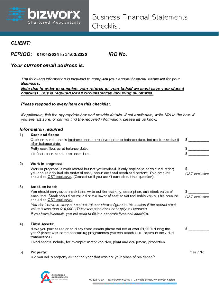 This document serves as a checklist for clients to provide necessary information and documents required to complete their annual financial statement for their business.