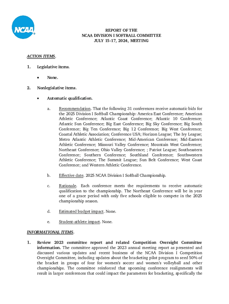 This document contains the minutes and outcomes from the NCAA Division I Softball Committee meeting held from July 15 to 17, 2024, detailing legislative and nonlegislative action items, reviews of