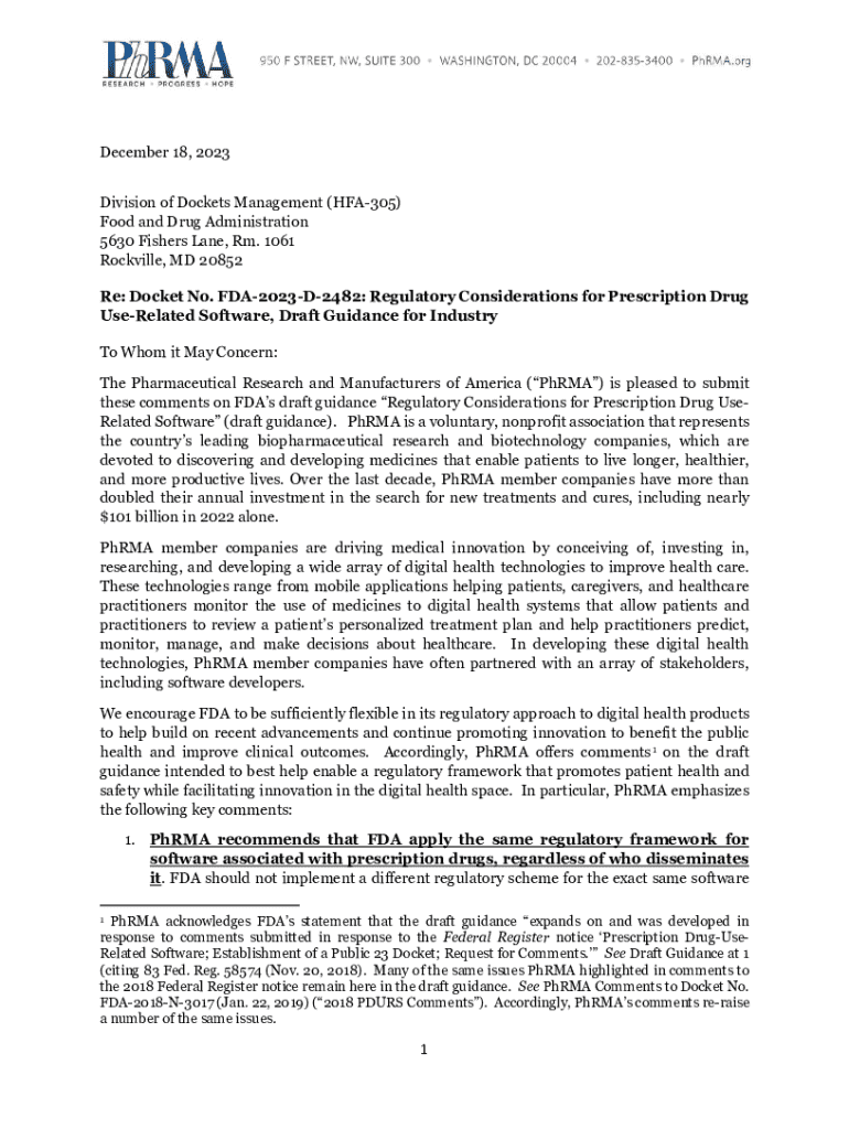 This document contains comments submitted by PhRMA on the FDA’s draft guidance regarding the regulatory framework for software associated with prescription drugs, emphasizing the need for consistency