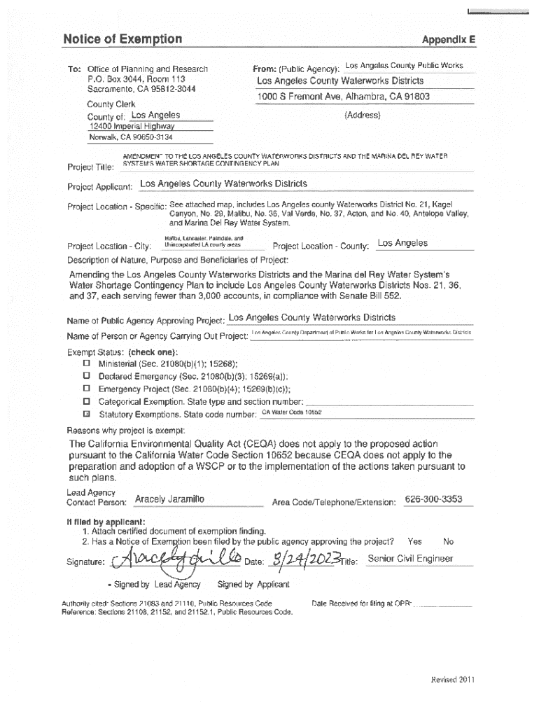 This document serves as a notice of exemption for amending the Water Shortage Contingency Plan of the Los Angeles County Waterworks Districts and the Marina del Rey Water System, in compliance with