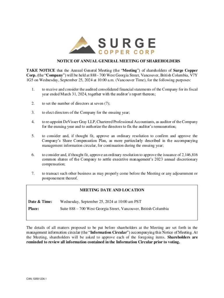 This document provides details regarding the Annual General Meeting of Surge Copper Corp. shareholders, including the agenda, location, date, and information on voting procedures.