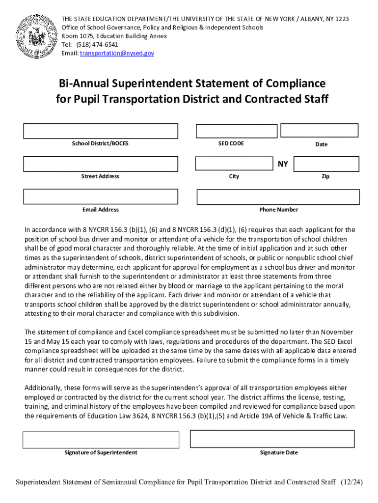 Get the free Bi-annual Superintendent Statement of Compliance for Pupil Transportation District a...