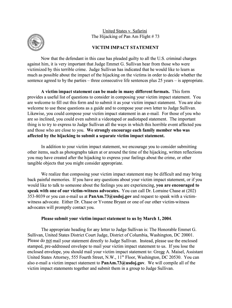 United States v. Safari The Hijacking of Pan Am Flight # 73 VICTIM IMPACT STATEMENT Now that the defendant in this case has pleaded guilty to all the U.S. criminal charges against him, it is very