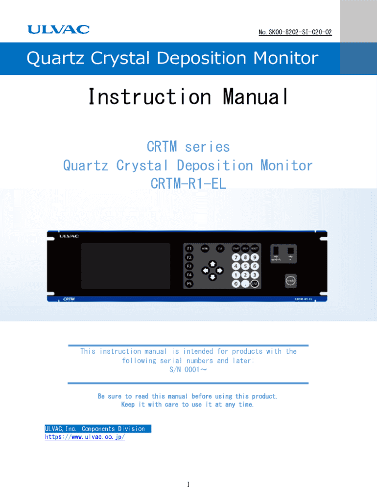 This instruction manual provides detailed information on the operation, installation, safety precautions, and specifications of the CRTM-R1-EL quartz crystal deposition monitor.