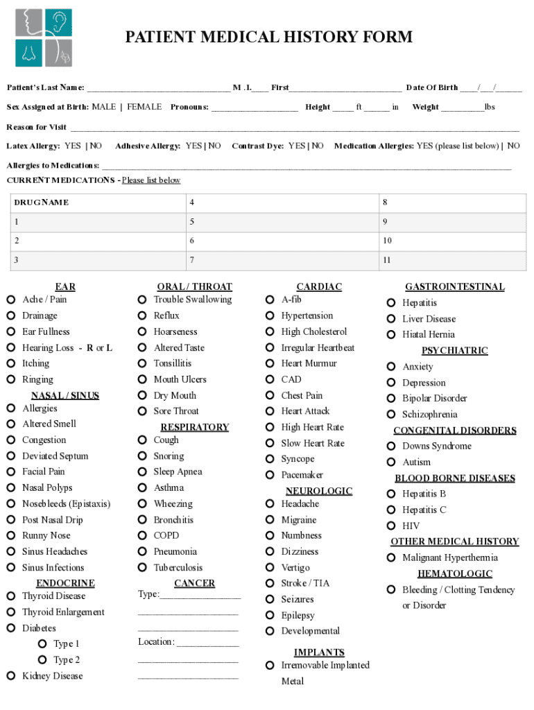 This form collects comprehensive medical history from patients, including allergies, medications, current health issues, and family history, to assist in their healthcare.
