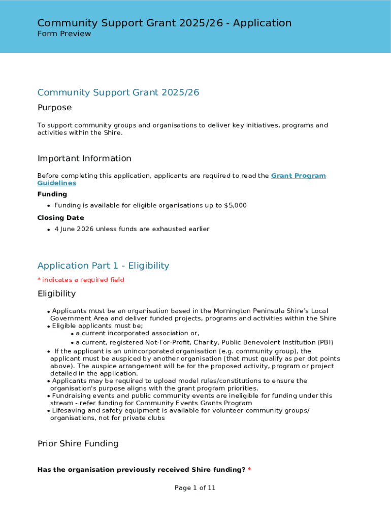 To apply for the Community Support Grant 2025/26, individuals, non-profits, and community organisations must meet specific eligibility criteria. Generally, individuals must demonstrate a commitment to community service, while organisations should be recognized entities in their respective communities. Geographic restrictions typically apply, with preference given to projects located within designated council boundaries or community focus areas. This ensures that the funding is utilized where it is needed most.