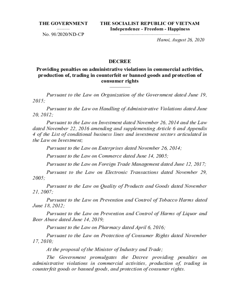 Nghị định quy định về xử phạt vi phạm hành chính trong lĩnh vực thương mại, sản xuất, kinh doanh hàng giả, hàng cấm và bảo vệ quyền lợi người tiêu dùng.