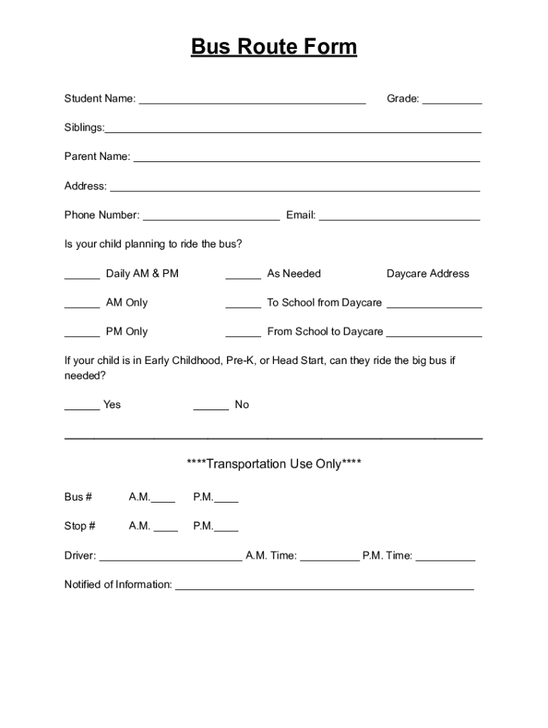 To effectively fill out the bus route form, you'll need to provide essential information clearly and accurately. Start by entering the bus route name and number, as this identifies the route within the transportation system. Next, specify the starting and ending points of the route, and along with that, detail all planned stops in between.