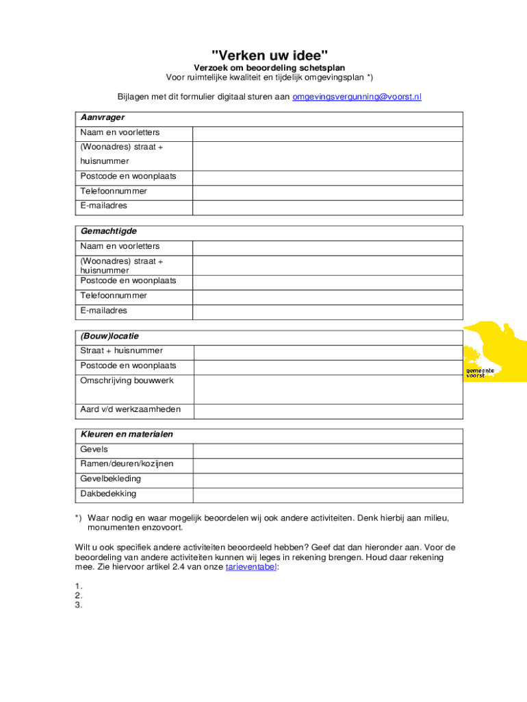 Dit document is een aanvraagformulier voor de beoordeling van een schetsplan dat betrekking heeft op ruimtelijke kwaliteit en een tijdelijk omgevingsplan.