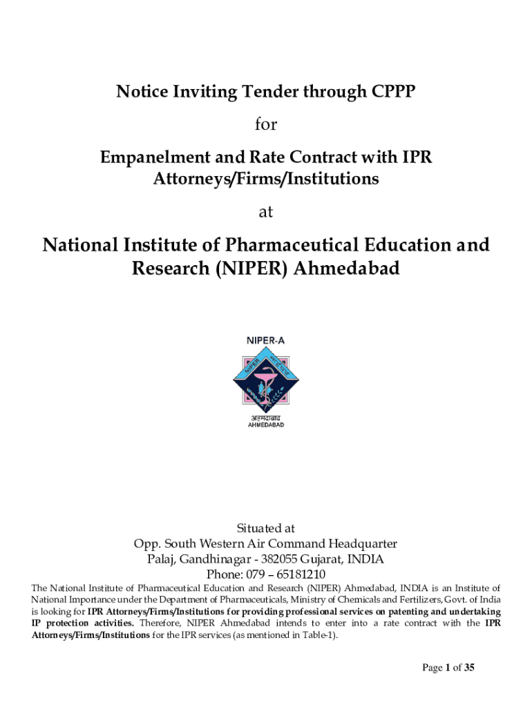 This document serves as an invitation to tender for empanelment and rate contracts with IPR Attorneys, Firms, and Institutions to provide professional services related to intellectual property rights