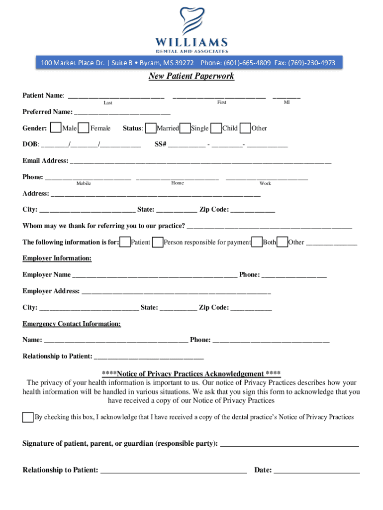 New patient paperwork forms are essential documents that new patients must fill out when they visit a healthcare provider for the first time. These forms typically collect vital information needed to evaluate a patient's health status and ensure safe and efficient medical care. The paperwork is crucial not just for the medical practice to maintain accurate records but also for patients to ensure that their health history and current needs are properly documented.