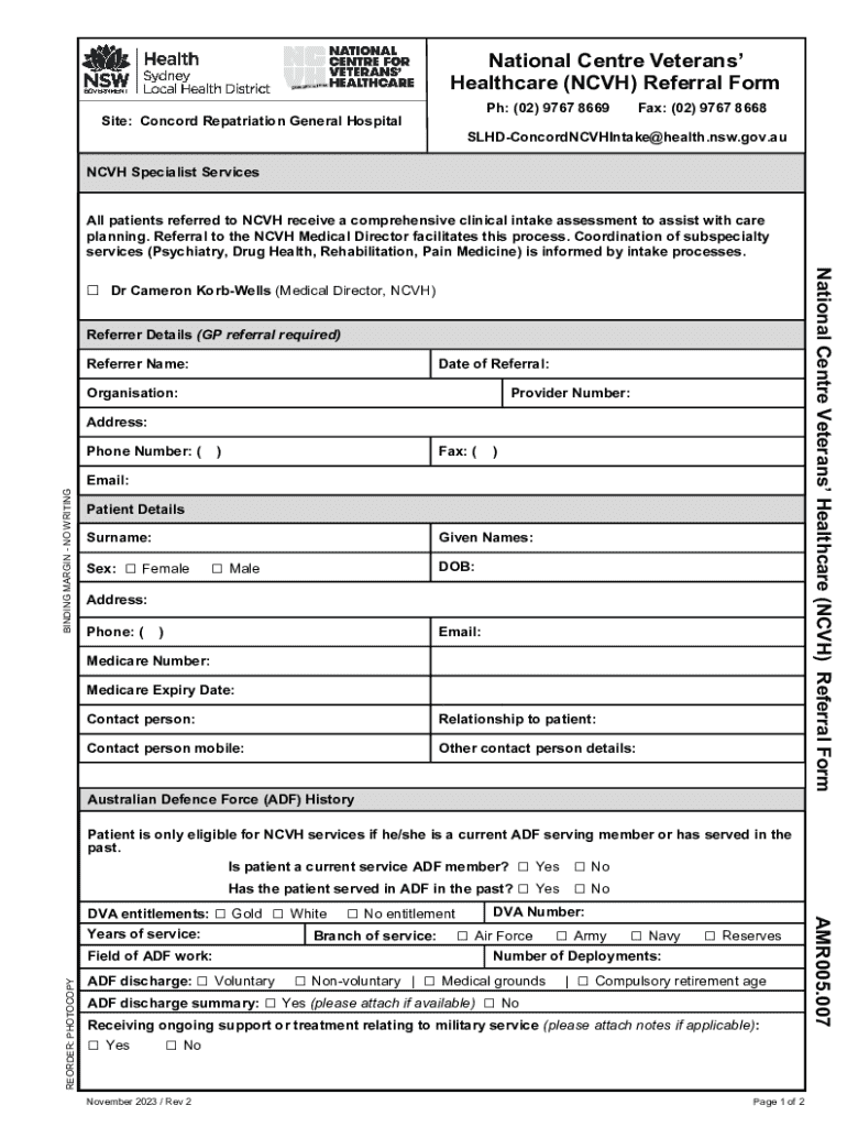 Get the free National Centre Veterans’ Healthcare (ncvh) Referral Form - rslnsw org