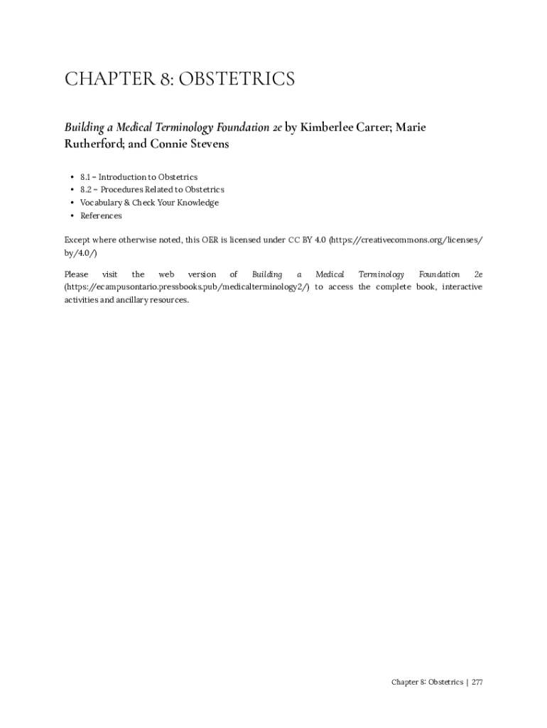 This chapter provides an introduction to obstetrics, covering medical terminology, procedures, common complications, and stages of childbirth.