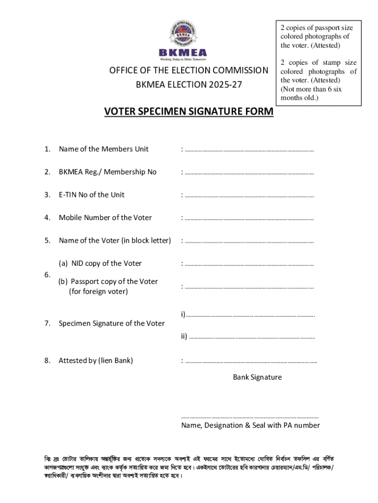 This document is designed for voters to provide their personal and identification information, including photographs, signatures, and bank attestation for participation in the BKMEA Election 2025-27.