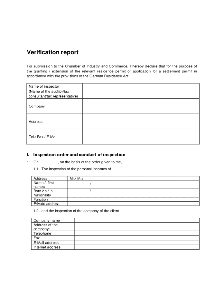 A verification report form is a structured document used to confirm and validate various details about individuals, organizations, or events. Its primary purpose is to provide a formal record of verification for specific claims or assertions. Common use cases for this form span multiple industries, including finance, healthcare, education, and employment verification. For example, in the finance sector, institutions might use these forms to verify a client's identity and financial background before approving loans.