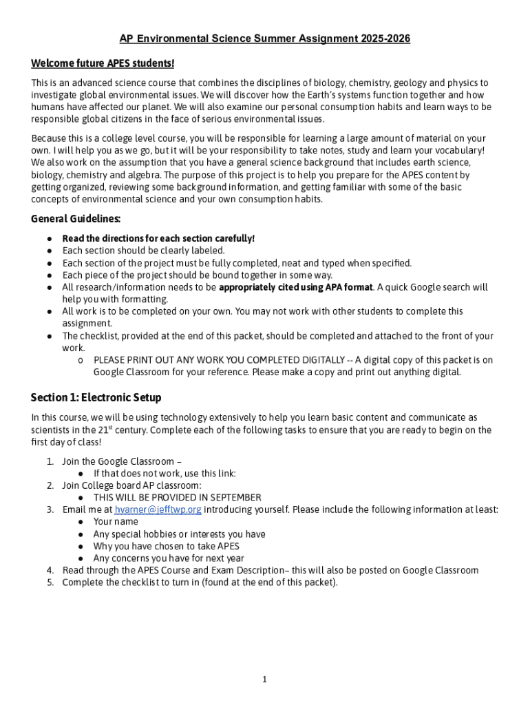 Get the free Ap Environmental Science Summer Assignment 2025-2026