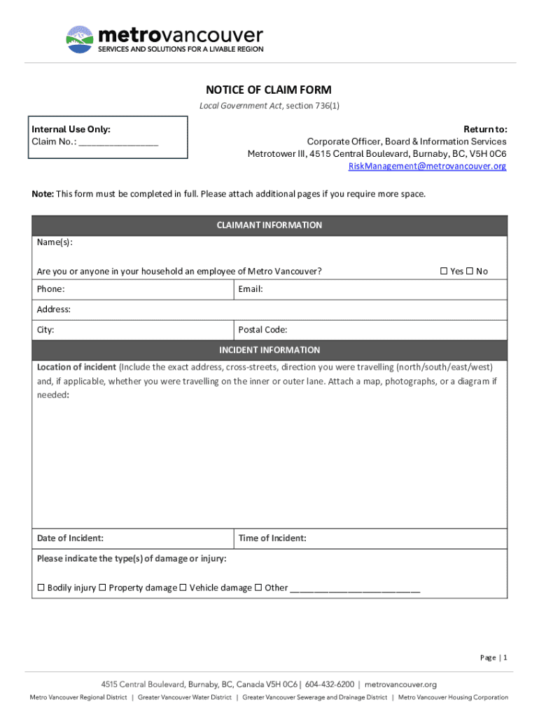 A notice of claim form is a vital document that serves as an official notification to an entity—often a government agency or a corporation—that you intend to file a claim for damages. The primary purpose of this form is to initiate a formal process for claims and grievances, allowing claimants to bring forward their issues legally and effectively.