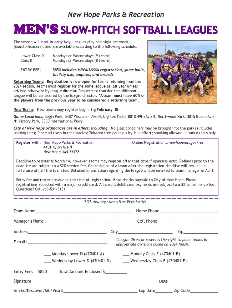 This document provides details regarding registration for the Men\'s Slow-Pitch Softball Leagues, including schedules, fees, rules, and contact information.