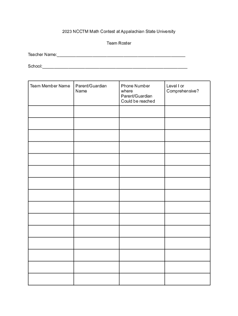 The NCCTM Math Contest team form is a critical component of the registration process, collecting essential information about each participating team. This form ensures that all details regarding team composition and member eligibility are documented accurately. Access to the team form is readily available online through pdfFiller, an intuitive platform that simplifies document management and editing.