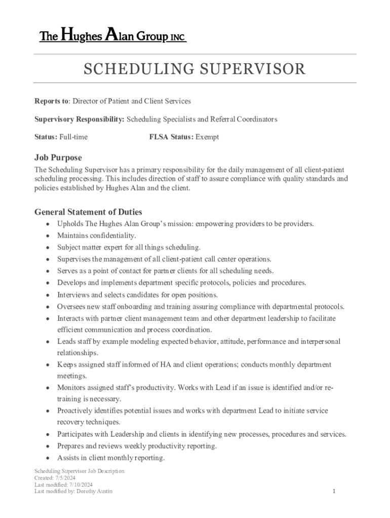 This document outlines the role, responsibilities, and qualifications for the Scheduling Supervisor position at The Hughes Alan Group, emphasizing management of client-patient scheduling, staff supervision,