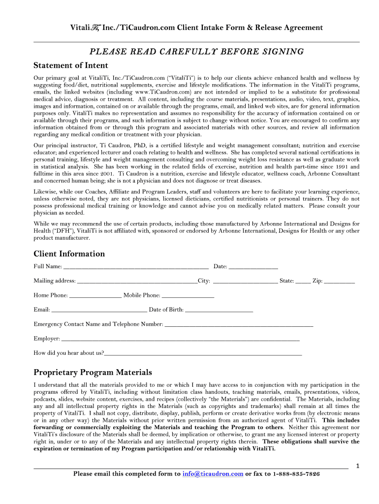Vitality, Inc./TiCaudron.com Client Intake Form & Release Agreement PLEASE READ CAREFULLY BEFORE SIGNING Statement of Intent Our primary goal at Vitality, Inc./TiCaudron.com (Vitality) is to help