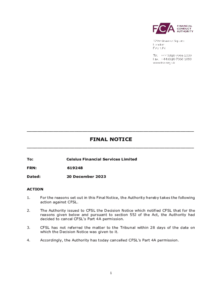 This document serves as a final notice issued by the Authority regarding the cancellation of Celsius Financial Services Limited\'s Part 4A permission due to non-compliance and failure to pay overdue