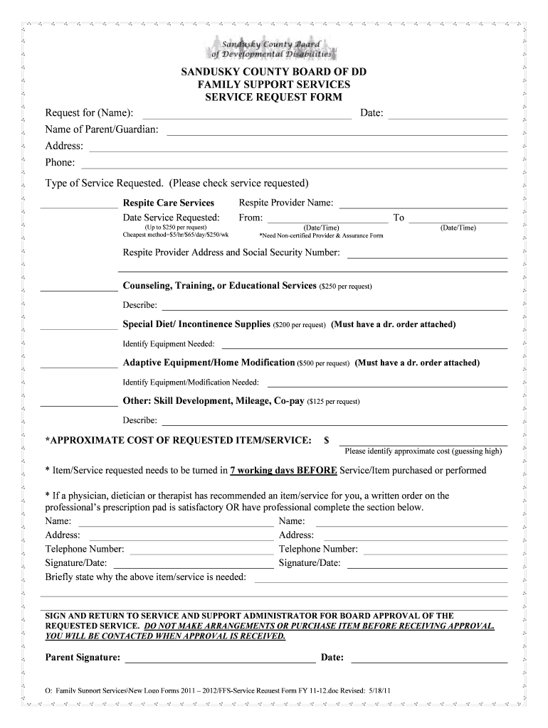 Request for (Name): Name of Parent/Guardian: Address: Phone: SANDUSKY COUNTY BOARD OF DD FAMILY SUPPORT SERVICES SERVICE REQUEST FORM Date: Type of Service Requested. (Please check service requested)
