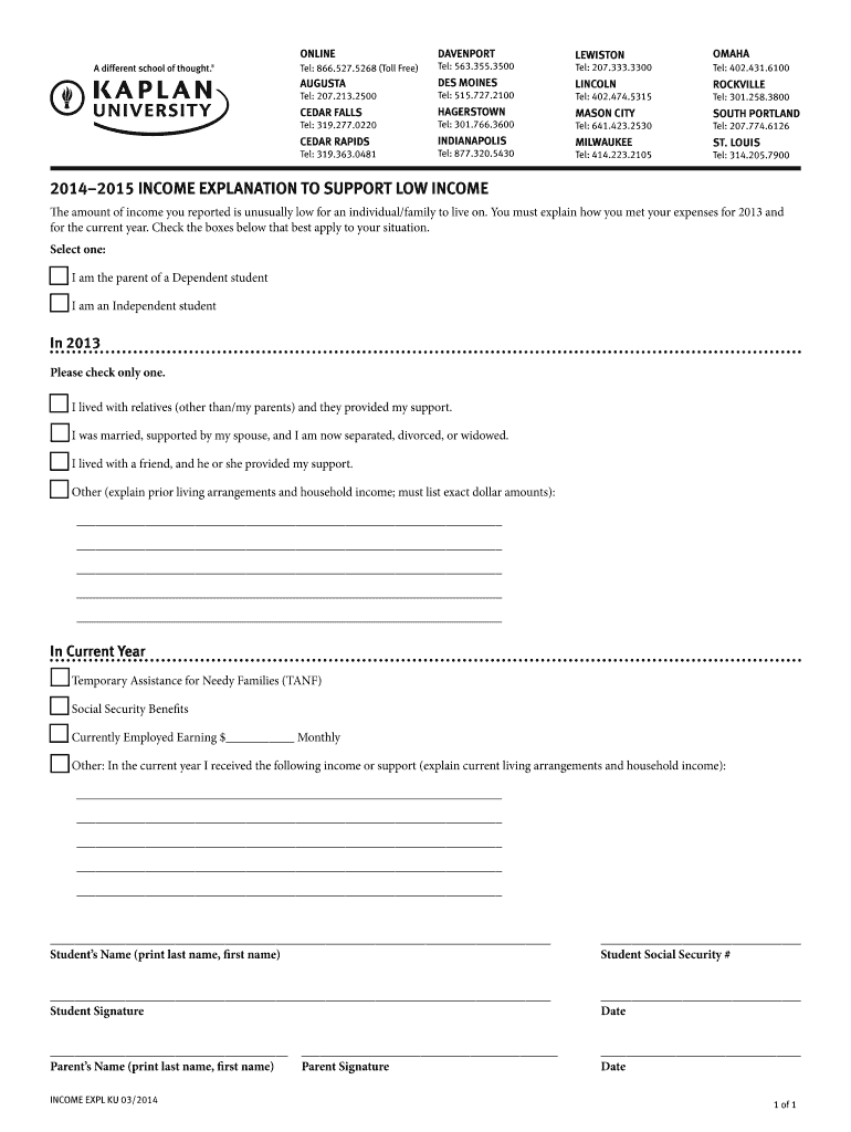 Get the free 2014 2015 income explanation to support low ... - Kaplan University