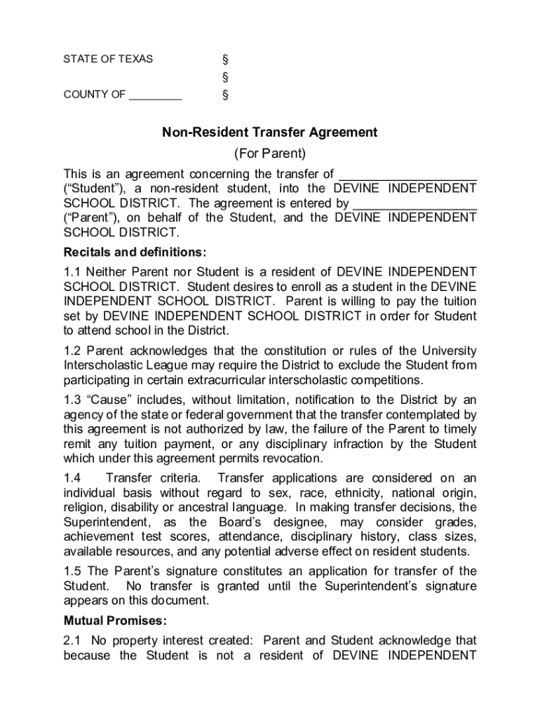 The non-resident transfer agreement form is a formally structured document that permits students who reside outside a specific school district to request enrollment in a different district. This form plays a crucial role in facilitating educational opportunities for families whose circumstances require a school change, often due to employment relocations, specialized program availability, or personal reasons.
