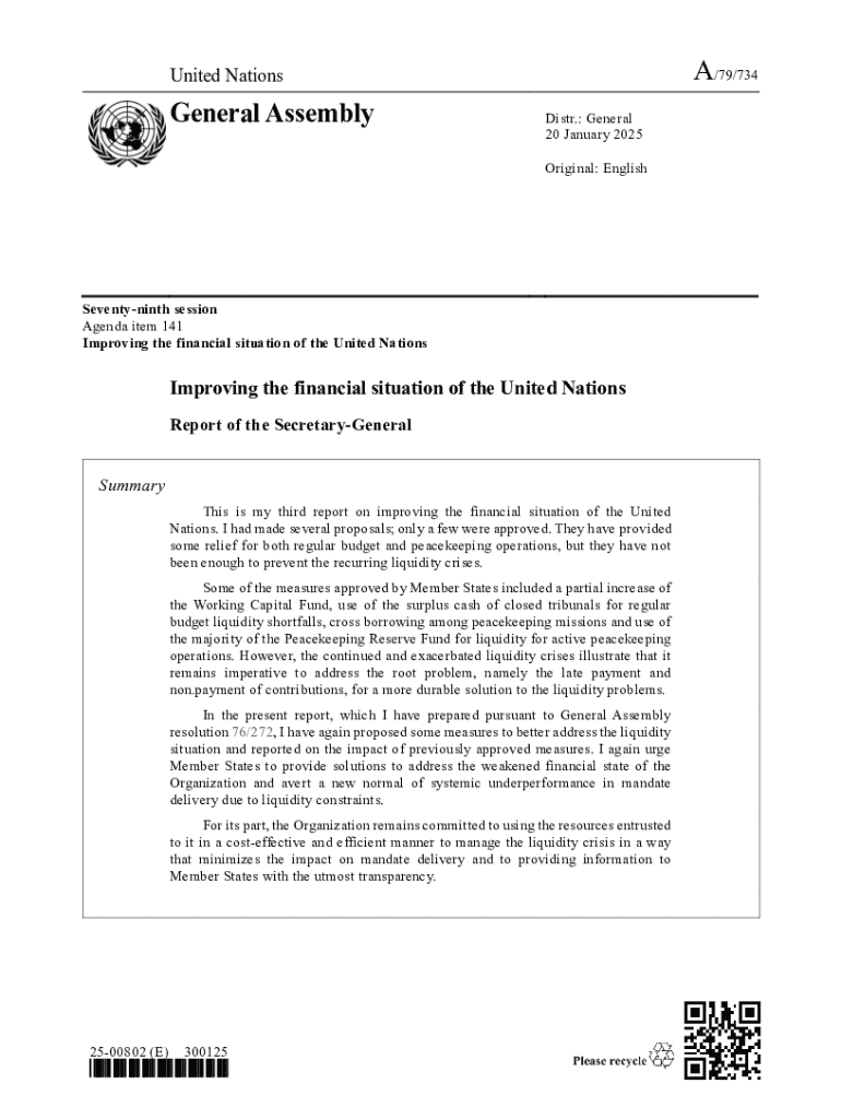 This document is a report by the Secretary-General addressing the financial challenges faced by the United Nations, outlining proposals for improving the financial situation, and detailing the impact