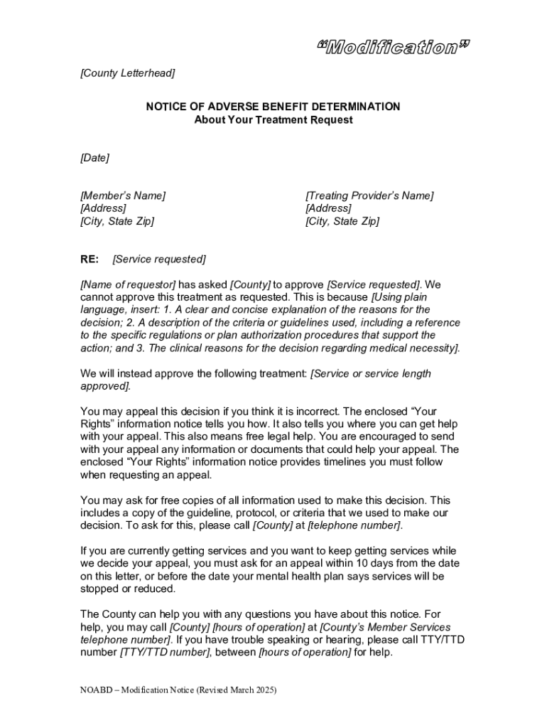The next crucial section describes the adverse decision itself. This may include the type of service denied, the date of the service, and specific references to the policy exclusions or limitations that resulted in the denial. Each Notice of Adverse Benefit Form also includes an explanation of rights, detailing how the beneficiary can appeal the decision and the time limits that apply.