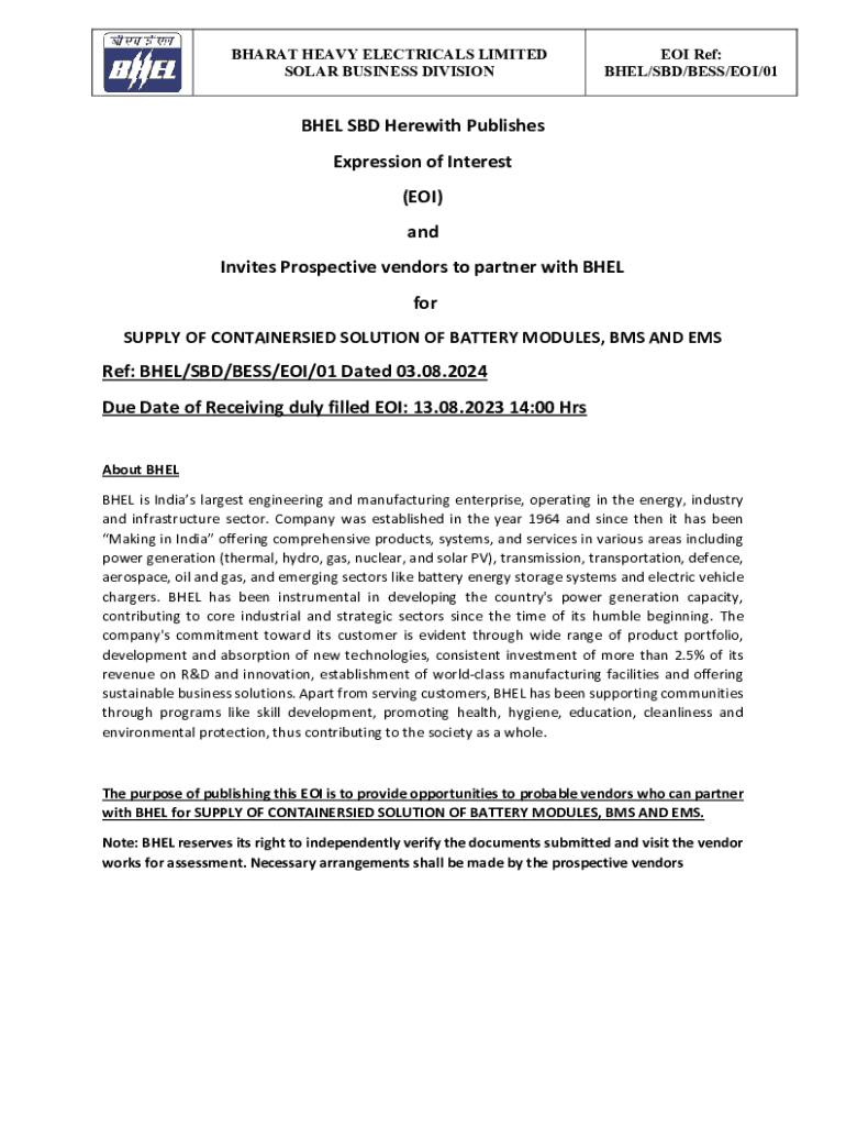 Bharat Heavy Electricals Limited (BHEL) stands as a pillar of India's engineering landscape, specializing in the manufacture and supply of heavy electrical equipment. Since its inception in 1964, BHEL has grown into one of the largest engineering and manufacturing companies globally. It plays a crucial role in the Indo-American and other international markets as well. For suppliers, the procurement process at BHEL is driven predominantly through Expressions of Interest (EOIs), which serve as an initial step towards securing contracts. The importance of these EOIs cannot be understated; they streamline BHEL's capability to identify and engage with potential partners who meet stringent quality and compliance criteria, particularly when it involves sectors like renewable energy where battery technology has become vital.
